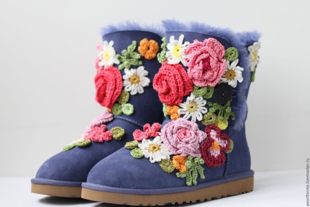 Terdapat juga model dengan mutiara, dengan paku, dengan tengkorak dalam bentuk rivet dan dengan manik. Musim ini, ia patut memberi perhatian kepada model dengan sulaman, kerana ia adalah hiasan yang kini berada di puncak populariti. Uggs dengan corak dengan tema bunga dan bunga pasti akan menarik perhatian orang lain.