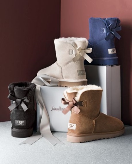 Butang Ugg dengan busur dicipta terutamanya untuk gadis romantis yang walaupun di musim sejuk tidak mahu berpisah dengan sifat yang benar-benar girlish. Boots dengan pita atau busur merupakan perwujudan sebenar kewanitaan.