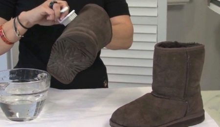 Menggunakan prinsip yang sama, garam boleh dikeluarkan dari uggs. Gunakan penyelesaian cuka dan ammonia. Letakkannya pada berus dan gosokkan sepatu anda dengan lembut, sambil tidak menekan dengan keras supaya tidak merosakkan bahan halus.