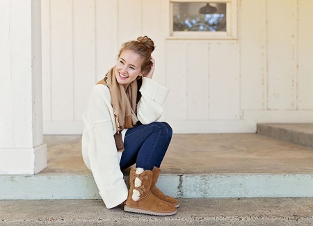 Kelebihan utama model ini adalah praktikal dan keaslian. Ini adalah but ringkas, dilengkapi dengan satu butang besar, yang berfungsi sebagai elemen hiasan yang bergaya. Di satu pihak, ia menghiasi dan menarik perhatian. Sebaliknya, ia tidak memaksa anda untuk apa-apa, tidak seperti model dengan busur atau rhinestones. Oleh itu, anda boleh memakai uggs dengan parka, kot bulu atau jaket bawah.