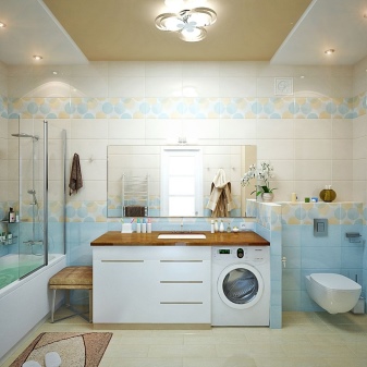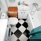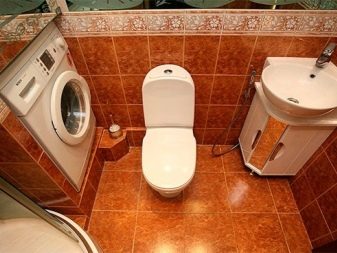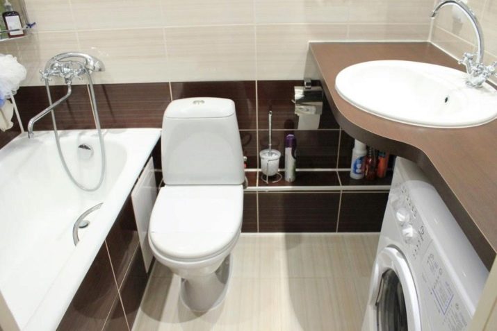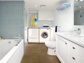 Terdapat praktikal tiada susun atur linear: untuk ini, terdapat ruang yang tidak cukup dalam bilik mandi gabungan. Walau bagaimanapun Pilihan susunatur berbentuk U ia mungkin jika bilik itu sendiri luas. Dalam kes ini, mandi atau pancuran terletak di satu sisi, mesin di tempat lain, sink dan tandas lebih sering dipasang di antara mereka.