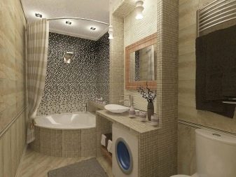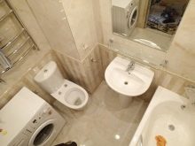 Dalam kes lain Susunan berbentuk L: mandi terletak di sepanjang dinding yang lebih kecil, di dekatnya ada tenggelam, di bawahnya adalah mesin basuh, di sebelahnya adalah tandas gantung dengan tangki longkang tersembunyi.