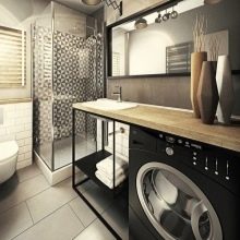 - Gaya minimalisme sesuai untuk bilik mandi kecil di mana anda perlu memasang mesin basuh kompak. Inilah kesederhanaan setiap elemen, ketiadaan gambar yang tidak perlu, sifat laconicism dan fungsi maksimum. Untuk arah reka bentuk vintaj, warna cahaya, lukisan bijak sesuai. Bilik mandi ini memerlukan suasana tertentu. Oleh itu, paip telah dipilih untuk reka bentuk lama, dan mesin basuh bertopeng dengan fasad perabot.