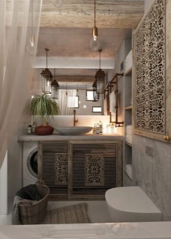 - Cawangan gaya stylist etnik (contohnya Oriental, Cina, gaya Scandinavia) perlu menggunakan elemen reka bentuk tertentu ciri kewarganegaraan mereka. Ecodesign memberi tumpuan kepada penggunaan tekstur kayu dan warna. Kreativiti di bilik mandi boleh dibuat dengan mengambil gaya loteng sebagai asasnya, dengan kecenderungan untuk membayangkan kekasaran dan tiruan dari kemudahan perindustrian yang didiami.