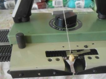 - Seterusnya, tetapkan skein benang. Benang yang berasal darinya terletak di mata yang terletak pada penyangga benang dan dilewati di antara plat ketegangan. Mereka menentukan ketegangan benang yang dibekalkan ke pengangkutan.