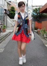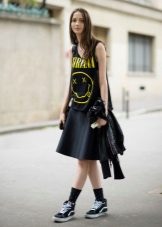 Sneakers zien er goed uit met rokken in verschillende stijlen en lengtes. Als een meisje bijvoorbeeld een model in plooi, coltrui en vest aantrekt, krijgen we een passend ensemble voor de school.