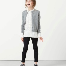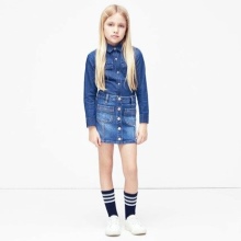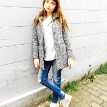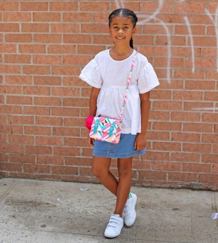 De kleine fashionista in haar stijlvolle look blijft helemaal niet achter bij haar moeder. Het meisje, dat ongeveer 8 jaar oud lijkt, wordt geschoeid in trendy sneakers in neutrale kleuren. Gemaakt in lichtgrijs, ze hebben een witte teen en zool. Het model is versierd met sluitingen in de vorm van brede banden met gespen. Sneakers passen perfect bij de outfit van de baby: een cropped lichtblauwe spijkerbroek, een vest van hetzelfde materiaal, maar in een donkerdere tint, en een wit T-shirt met een meisjeshartpatroon. Ideaal om met je moeder, die op dezelfde manier gekleed is, door de stad te wandelen.