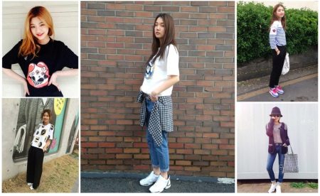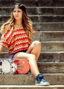 De richting van de afbeelding bepaalt in dit geval de bovenkant. Als het meisje van sportstijl houdt, moet ze een volumineus sweatshirt, sweatshirt, een ruim geruit overhemd of een T-shirt dragen. Het resultaat is een pittig en een beetje brutaal beeld.