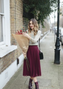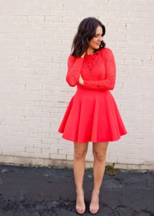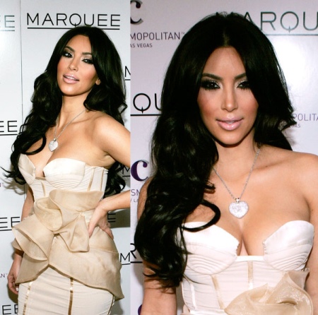 Hvis du planlegger å gå ut og vil fremheve alle på en luksuriøs måte, ta eksemplet til Kim Kardashian. Melkedesigner, bustier kjole med en dyp utringning. Det er dekorert med chiffongdraperi i midjeområdet i fargen på cappuccino. Av smykkene - bare et anheng i form av et stort hjerte, strødd med en spredning av små steiner.