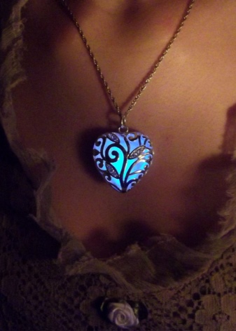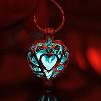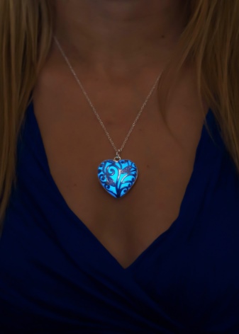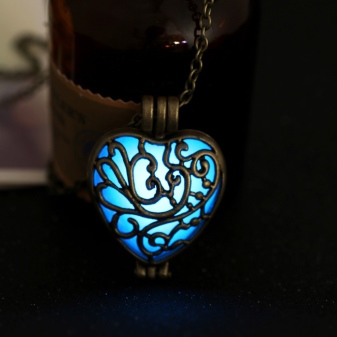 Uvanlige smykker, populære blant unge jenter. En stein med et selvlysende pigment er plassert i et hjerteformet anheng, som begynner å glø i mørket. For dette er det nødvendig at han oftere møter sollys. Dette er ikke vanskelig, for i løpet av dagen ser det ut som en vanlig dekorasjon.