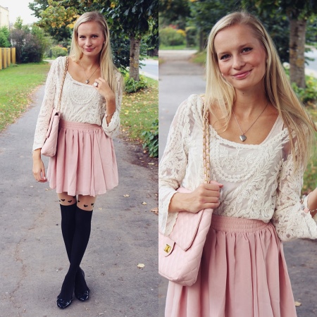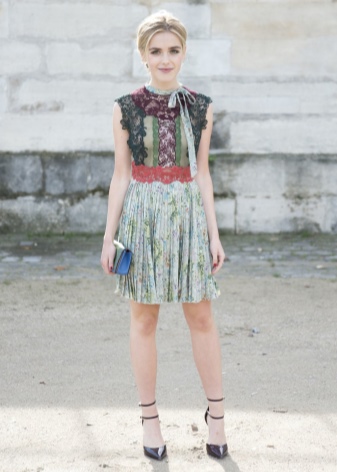 Flott se etter en date. En romantisk kjole med blomstertrykk, som er spektakulær og beskjeden på samme tid. Sorte høyhælte sko, en liten clutch i tone og et sølv anheng i form av et hjerte. Veldig hyggelig!