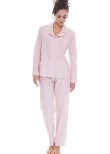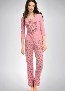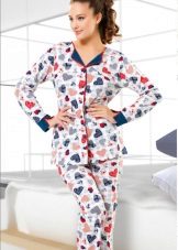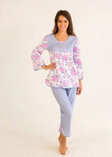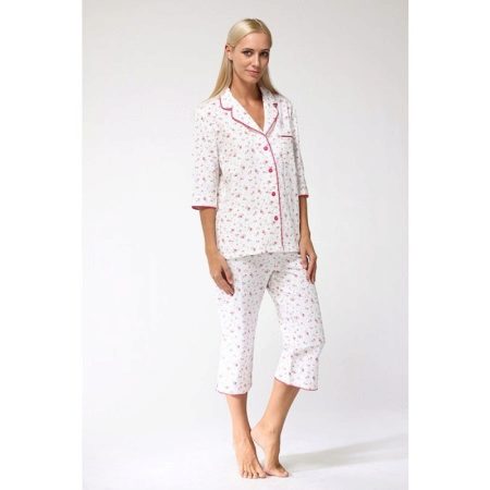En litt lett modell av varme pyjamas er muligheten til forkortede bukser og gensere med knapper med en 3/4 ermet. Et trykk i et lite blomstermønster på hvit bakgrunn vil understreke femininiteten til eieren, og den tynne rosa kanten på kantene på produktet vil skygge konturene av lyse pyjamas litt.