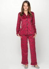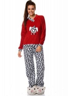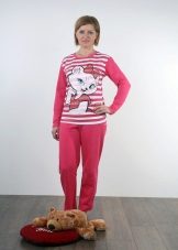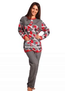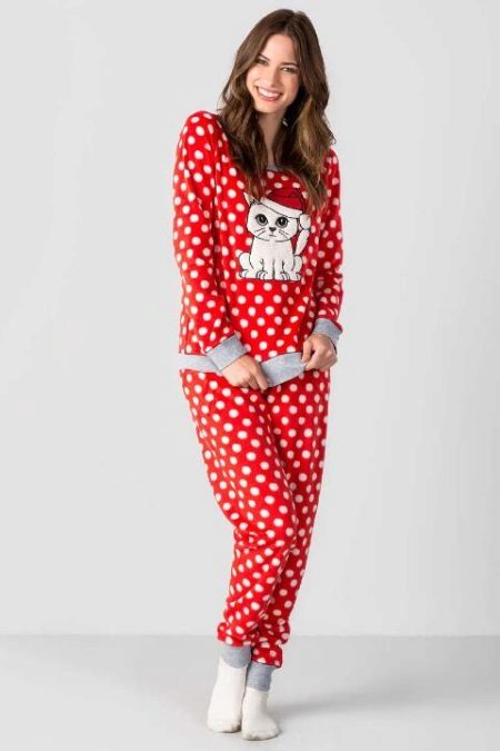 De rødfargede bomullspyjamasene har et stort ertuttrykk, i tillegg til et dekorativt element i form av et bilde av en hvit kattunge. Denne modellen er spesielt praktisk på den måten at den har trekkelementer i mansjettene, samt i bunnen av buksen. Mangel på et feste gjør et produkt det mest passende og trivelige for en drøm.
