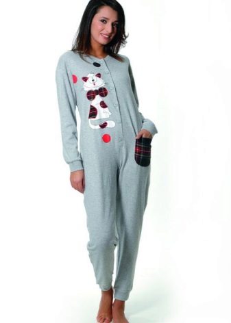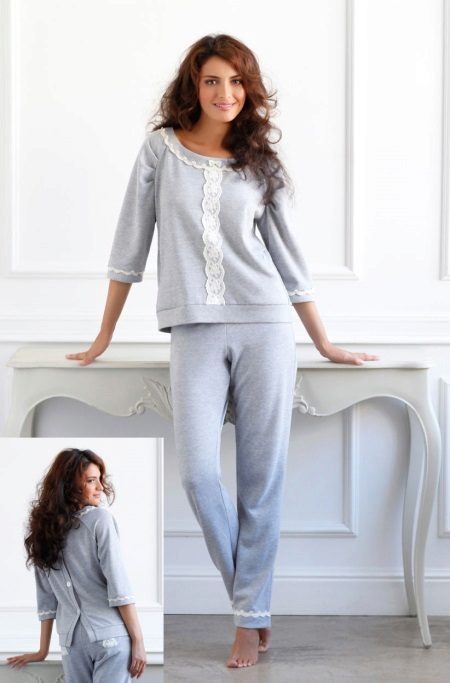 Pyjamas av deres tette bomullsstoff i lysegrå farge ser veldig skånsom ut. Produktet virker vanlig og hverdagslig, hvis ikke for dekorative elementer i form av hvit blonder og små buer. Og låsen på baksiden er en uvanlig løsning og blir et slags høydepunkt i bildet.