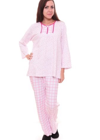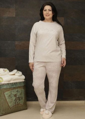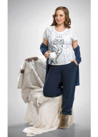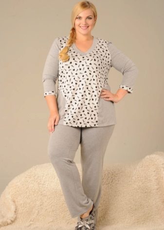 Store pyjamas har en løs passform, og buksene er utstyrt med et svakt elastisk bånd og en trekkstreng, for ikke å gi eierne av krumformede former ubehaget som skapes ved å presse et eller annet område av kroppen.