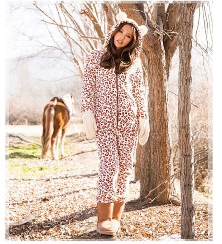 Dyretrykk har ikke gått av moten på flere sesonger, og pyjamas i denne stilen, laget av mykt fleece-materiale, vil ligne huden til et vilt dyr. Varm jakke med glidelås har et dekorativt element i form av ører på hetten, noe som gir produktet et enda mer pent og lekent utseende.