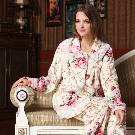 Plysjpyjamas, bestående av en genser med knapper og bukser, er kuttet og sydd i overdimensjonert stil - det vil si at den har et løst kutt, som kombinert med mykheten i stoffet gir maksimal komfort. Blomstertrykk og blonder på kragen, samt i bunnen av produktet, gjør det utrolig søtt og romantisk, noe som uten tvil vil appellere til enhver jente.