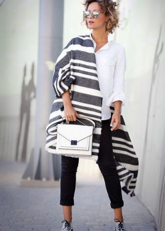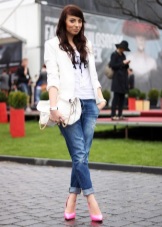 Laconic mamma-jeans og en streng vertikalstripet turtleneck passer til hverdagsklær. Bildet ser ikke kjedelig ut, takket være metalliske fuchsia-loafers. Kompletterer den lille vesken hans med en pels nøkkelring og solbriller.