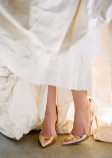 Bryllupssko fortjener spesiell oppmerksomhet, fordi mange jenter kompletterer bryllupsutseendet sitt med metalliske eller paljette sko. Slike sko vil tilføre et element av luksus sammen med og få deg til å føle deg som en ekte Askepott, omgjort til en prinsesse.