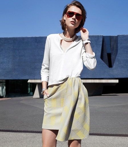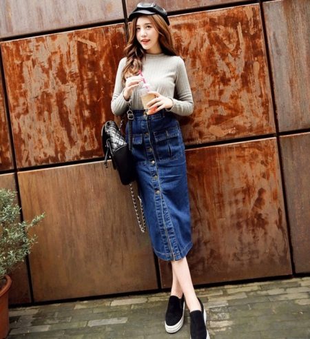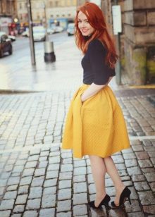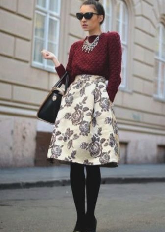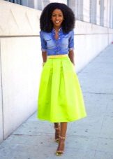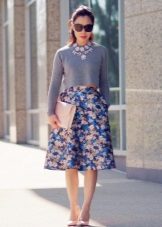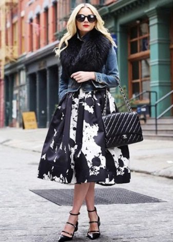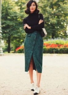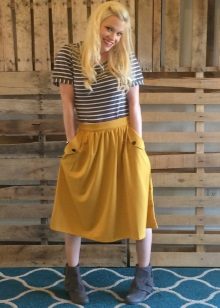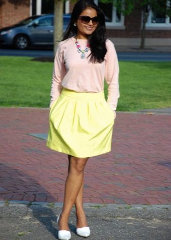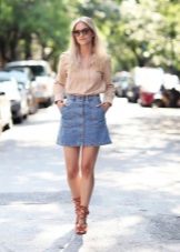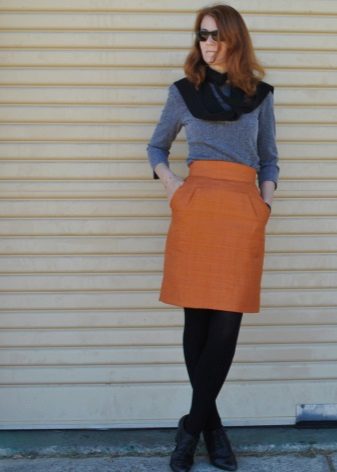 Yttertøy til et skjørt med lommer kan tjene som jakke, cardigan, frakk eller jakke. Sko for et slikt skjørt kan velges som høyhælte sko, sandaler eller støvler, samt røffe sko, joggesko eller modeller på plattformen.