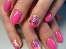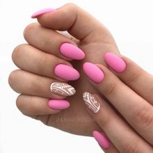 - Dla odważnych kobiet odpowiedni jest chwytliwy manicure, w którym różne wzory są wykonane przy użyciu różowego lakieru żelowego na wszystkich paznokciach.