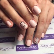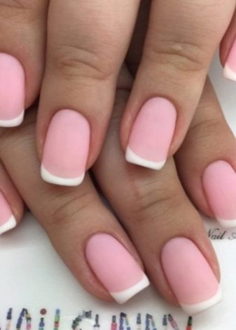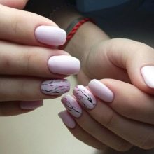 - Tradycyjny błyszczący lakier zastąpiono matowym analogiem. Z jego pomocą powstaje niezwykle delikatny wzór paznokci, który nadaje im specjalny wygląd porcelany. Ta opcja jest najczęściej realizowana w jasnoróżowym kolorze.