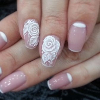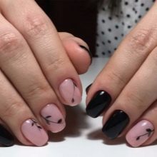 - Delikatny kolor w połączeniu z czernią pomoże stworzyć oryginalny manicure. W tym samym czasie przydatne będą wzory imitujące pąki róży.