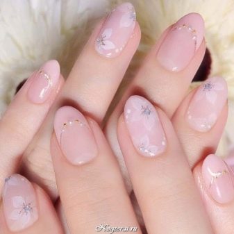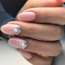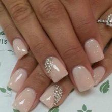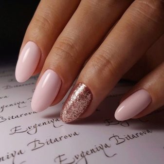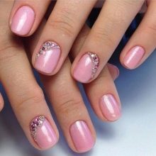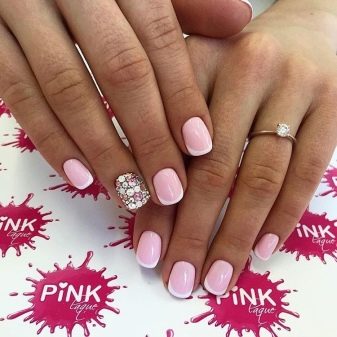 - Jasnoróżowy cień jest idealny dla tych kobiet, które chcą dodać kobiecości dodatkowego akcentu. Często do takiego manicure używa się lakieru żelowego z błyskami i cekinami, które z reguły obficie pokrywają płytkę paznokcia.