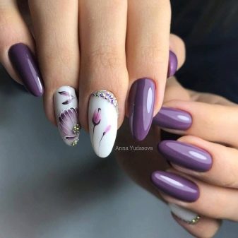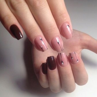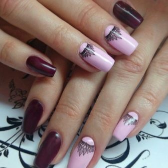 Jako dodatkowy ton w burgundowym manicure stosuje się różowy żelowy lakier o delikatnych odcieniach. Na jednym lub dwóch paznokciach widać tak delikatny ton, który pomaga „rozcieńczyć” nasycenie ciemnoczerwonego. W tym przypadku na tym paznokciu często widać wzory, które pokrywają się z kolorem głównego lakieru żelowego.