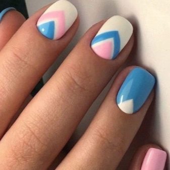 Jeśli szary kolor w podobnym zestawie zostanie zastąpiony niebieskim, manicure stanie się bardziej kontrastowy. Aby wygładzić taką kombinację kolorów, mistrzowie dodają trzeci kolor, na przykład biały. Jest używany w małych ilościach do utworzenia wzoru lub geometrii.