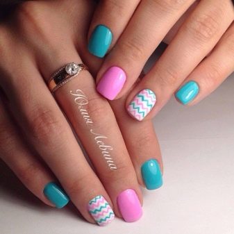 Jeszcze bardziej kontrastową opcją jest połączenie różowego lakieru hybrydowego z turkusem. Im bardziej chwytliwy chcesz zrobić manicure, tym jaśniejszy powinien być ciepły ton. Te dwa kolory mogą być częścią wzoru geometrycznego. Jako bardziej powściągliwą opcję można użyć turkusowego odcienia z jasnoróżowym. Ta kombinacja jest świetna do tworzenia codziennej opcji projektowania.