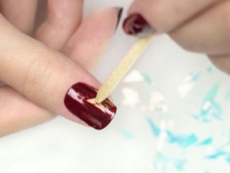 - Będziesz potrzebował popychacza z gumowym końcem, za pomocą którego musisz przenieść folię do paznokcia gładkimi ruchami wygładzającymi. W takim przypadku ruchy będą przechodzić od środka do krawędzi, aby uniknąć zagnieceń.