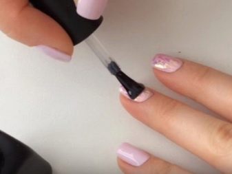 Jeśli w domu nie ma kleju do folii, możesz w tym celu użyć warstwy samoprzylepnej lakieru hybrydowego. Aby to zrobić, nałóż go koniecznie dwiema cienkimi warstwami.Pierwszy suszy się jak zwykle w lampie UV. Drugi właśnie zaczyna polaryzować, trzymając przez 25 sekund pod lampą. W ten sposób otrzymujemy solidną i lepką podstawę do dalszego nakładania z niej folii lub elementów dekoracyjnych.