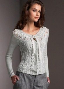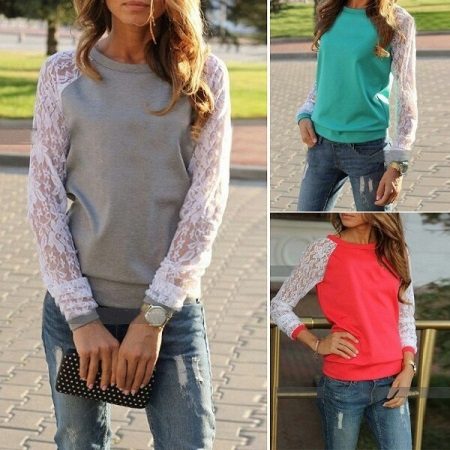 Popularną opcją dla swetrów z długimi rękawami jest klasyczny dzianinowy model z koronkowymi rękawami. Przód i tył takiego swetra są wykonane z szarej dzianiny, a rękawy z białej koronki. Ten model doskonale komponuje się z lekkimi jeansami i baletami o zastrzeżonych, jasnych odcieniach.