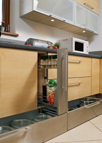 - Możliwe będzie dodanie poziomów funkcjonalności za pomocą właściwego wykorzystania wolnej przestrzeni między szufladami a podłogą. W tym celu w strefie, w której ukryta jest podstawa, możesz umieścić jedno lub więcej pudeł wyposażonych w prowadnice lub małe kółka do poruszania się. Jeśli przednia strona takich konstrukcji będzie składać się z odciętej piwnicy, właściciel kuchni będzie mógł nie tylko ozdobić obszar pod szafkami, ale także racjonalnie wykorzystać go do przechowywania różnych przedmiotów lub rzeczy.W zależności od wysokości podstawy istnieją opcje do umieszczania drobnych przedmiotów w tej przestrzeni, chemii gospodarczej, a nawet przyborów kuchennych, zapasów produktów o długim okresie trwałości itp.