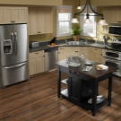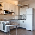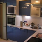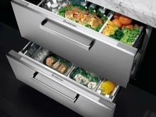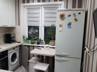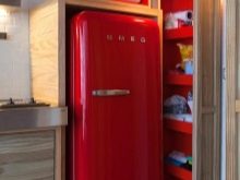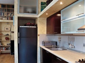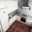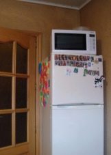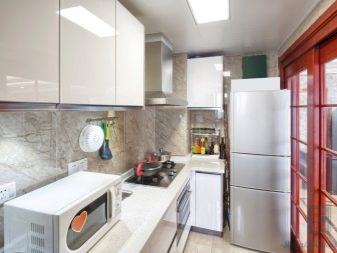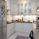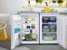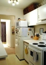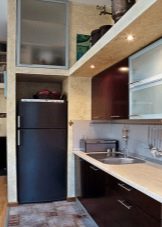 - jeśli nie masz zwykłej, ale kompaktowej lodówki, która nie przekracza wysokości blatów roboczej kuchni, najlepiej jest umieścić ją pod nią, co pozwoli ci pokonać projekt drzwi, projektując ją pod ogólną fasadą kuchni, a także znacznie zaoszczędzisz miejsce w małej kuchni znajdującej się , na przykład w Chruszczowa;