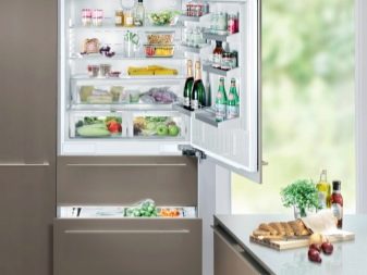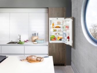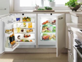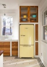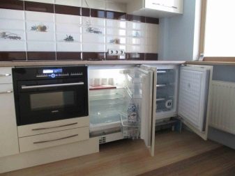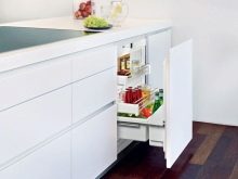 - Wbudowana lodówka jest kolejną kompaktową wersją lodówki kuchennej. Małe urządzenie, znajdujące się na drugim poziomie zestawu słuchawkowego, będzie dość wygodne, ponieważ wszystkie główne produkty będą w zasięgu wzroku. A także możesz umieścić większy sprzęt w pobliżu szafek niższego poziomu.