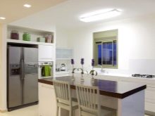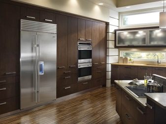 - najbardziej kompaktową opcją do umieszczenia dużej lodówki jest pozycja w rogu kuchni, gdzie jej wymiary nie będą wydawały się tak nieporęczne; ten typ ustawienia jest optymalny, jeśli długość ściany, której tyłem będzie stała, wynosi co najmniej 5 m, co umożliwia umieszczenie stołów roboczych i sprzętu wzdłuż ściany wraz z urządzeniem; Będzie miło, jeśli jedna ze ścian narożnika, do którego przylega lodówka, znajduje się w pobliżu okna, ale jednocześnie światło nie pada na samo urządzenie.