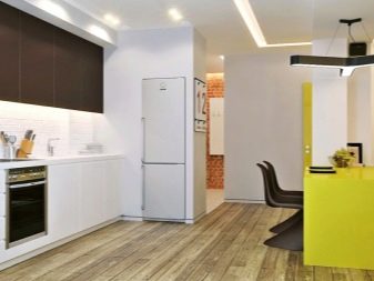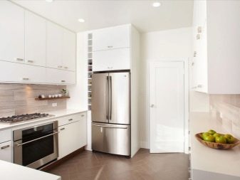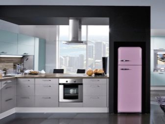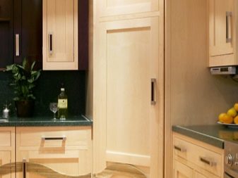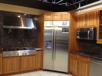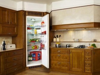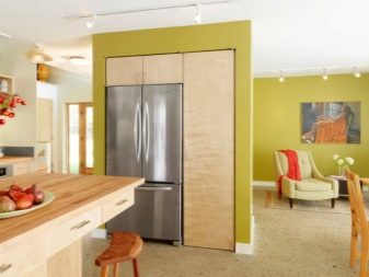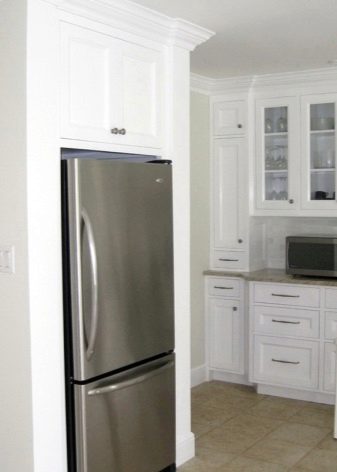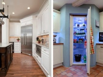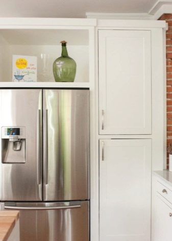 - Nie zawsze lodówka musi być zlokalizowana bezpośrednio. Może stać po przekątnej w rogu zestawu słuchawkowego. Jednocześnie można stworzyć dla niego niszę dopasowaną do zestawu słuchawkowego. Jednak ta opcja jest dopuszczalna tylko dla właścicieli przestronnych urządzeń kuchennych.