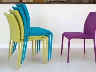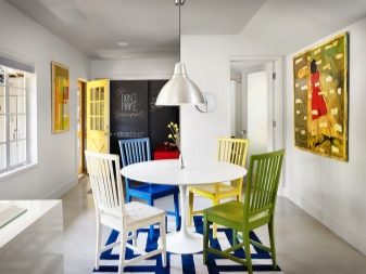 Aby urozmaicić wnętrze kuchni i uczynić atmosferę w niej bardziej nieformalną, możesz wybrać kolorowe krzesła. W takim przypadku model powinien być tak prosty, jak to możliwe, bez widocznych szczegółów. Tę samą technikę można zastosować, jeśli trudno jest dokonać wyboru - każdy członek rodziny może zamówić opcję koloru, która mu się bardziej podoba. Istnieją również odwrotne przykłady - gdy wszystkie krzesła są tego samego koloru, ale różnią się kształtem. Ważne jest, aby przestrzegać proporcji i wielkości, w przeciwnym razie poszczególne krzesła będą się mocno wyróżniać.