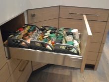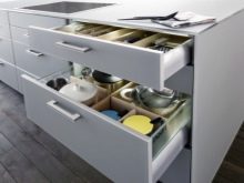 Do przechowywania zastawy stołowej lepiej jest kupić produkt w postaci komody, która jest wyposażona w małe szuflady z siatkowym dnem. Szerokość szuflad waha się od 60 do 80 cm Niektóre modele mają kombinowane wypełnienie, które składa się z szuflad na małe przybory i półek na duże przybory kuchenne.