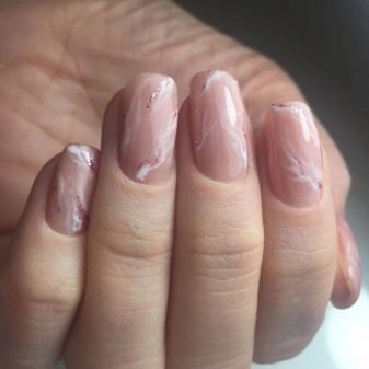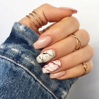 Popularny jest również tak zwany marmurowy projekt paznokci., która ma swoją nazwę dzięki materiałowi o tej samej nazwie. Dzięki kompetentnej technice wykonawczej będzie wyglądać bardzo nietypowo i realistycznie. Taki manicure będzie dobrym dodatkiem do sukienek wykonanych z ciepłych materiałów.