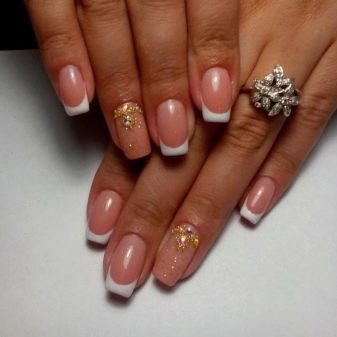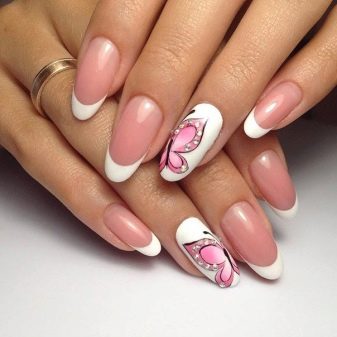 Nie zapomnij o standardowym francuskim manicure, wykonanym w kolorze białym. Ten projekt jest najbardziej popularny wśród płci pięknej, niezależnie od wieku. Francuski pasuje do prawie każdego stroju i będzie odpowiedni w każdej sytuacji życiowej - zarówno podczas uroczystej uroczystości, jak i w miejscu pracy w biurze. W razie potrzeby możesz dodać skręcie do projektu w postaci eleganckiego wzoru pasującego do sukienki, ozdobionego dżetów lub obrazów. Na przykład delikatny motyl lub pełen wdzięku kwiat może stać się pięknym dodatkiem.