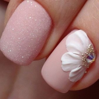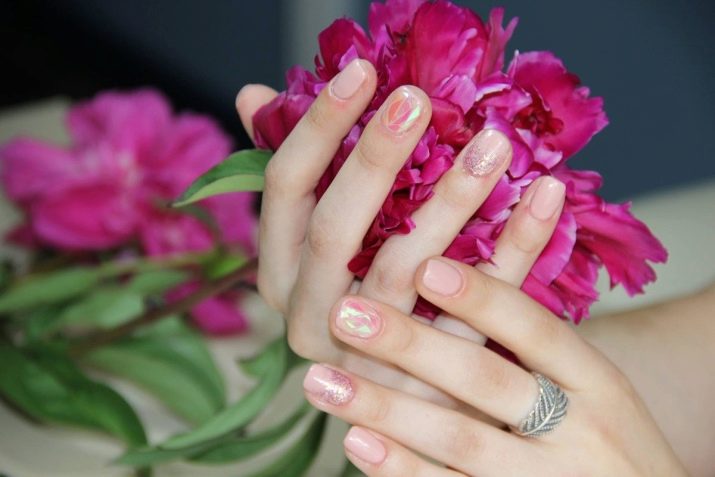 Naturalne odcienie nude w manicure słusznie zajmują wiodącą pozycję przez długi czas. Są one łączone z dowolnym kolorem w szafie. Projekt może być bardzo różnorodny: od ozdabiania jednym lub dwoma kryształkami po rozrzucanie kamieni na jednym z gwoździ.