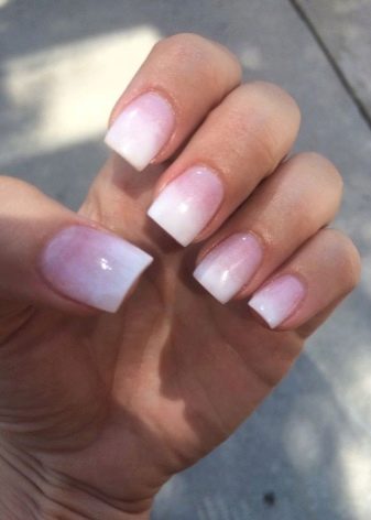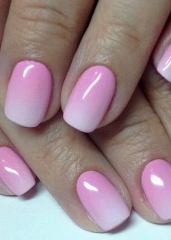 Technika wykonywania manicure zwana gradientem była bardzo popularna, gdy każdy kolejny odcień jest jaśniejszy od poprzedniego lub łączy płynne przejście z jednego odcienia do drugiego. W kolorze różowym i białym ten projekt wygląda delikatnie i wyrafinowanie. Idealnie nadaje się na sukienkę z szyfonu, jedwabiu, satyny.
