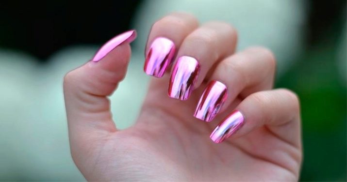 Projekt za pomocą lustrzanego pocierania w różowym odcieniu będzie również doskonałym dodatkiem do każdego obrazu. Taki manicure z pewnością nie będzie nudny, a hipnotyzujący przelew kolorów nie pozostawi nikogo obojętnym.