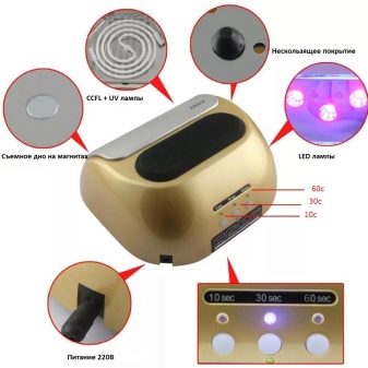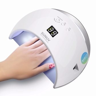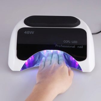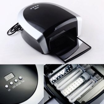 Hybrydowe urządzenia do wykonywania zabiegu manicure lub pedicure wyróżniają się rodzajem materiału korpusu (zwykle z tworzywa sztucznego), obecnością lub brakiem „odbłyśnika” w środku oraz mocą świecących elementów (36/48 W).
