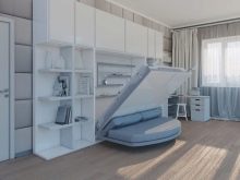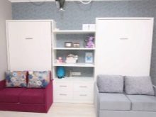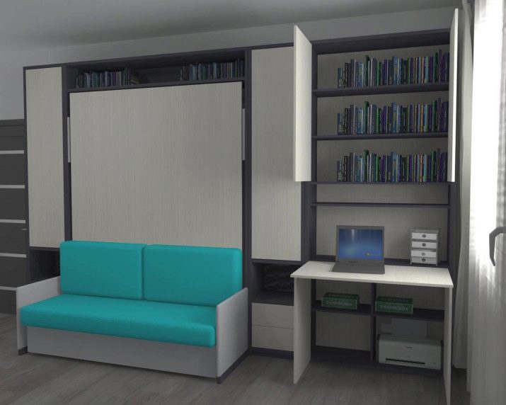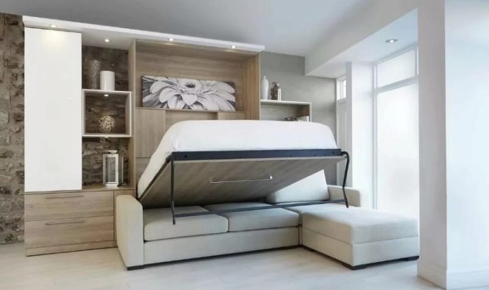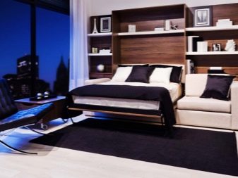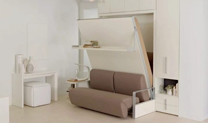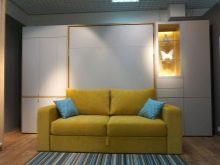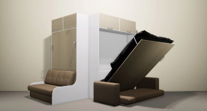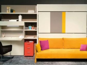Są takie, które po złożeniu wyglądają jak otomana z poduszkami, wbudowane we wnękę z półką wspornikową. Transformacja tych produktów jest różna, ale częściej miejsce do spania znajduje się nad sofą. Jego tył można ozdobić dowolnym nadrukiem. Po rozłożeniu blok do spania z materacem opuszcza się na sofę.