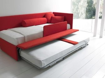 Jednak w przeciwieństwie do nich, niższy poziom ma wygodne miękkie oparcia i podłokietniki. Ponadto dwupoziomowe rozkładane sofy mogą mieć przestronne szuflady do przechowywania pościeli.