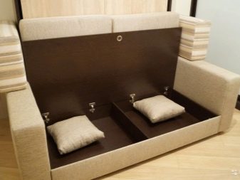 Jeśli sofa ma miękkie modułowe poduszki do siedzenia, na ich życzenie utwórz zagłówek. Jeśli nie jest to konieczne, są one czyszczone w wewnętrznych komorach lub szufladach na pościel. Półki tych mebli są małe i niezbyt szerokie.